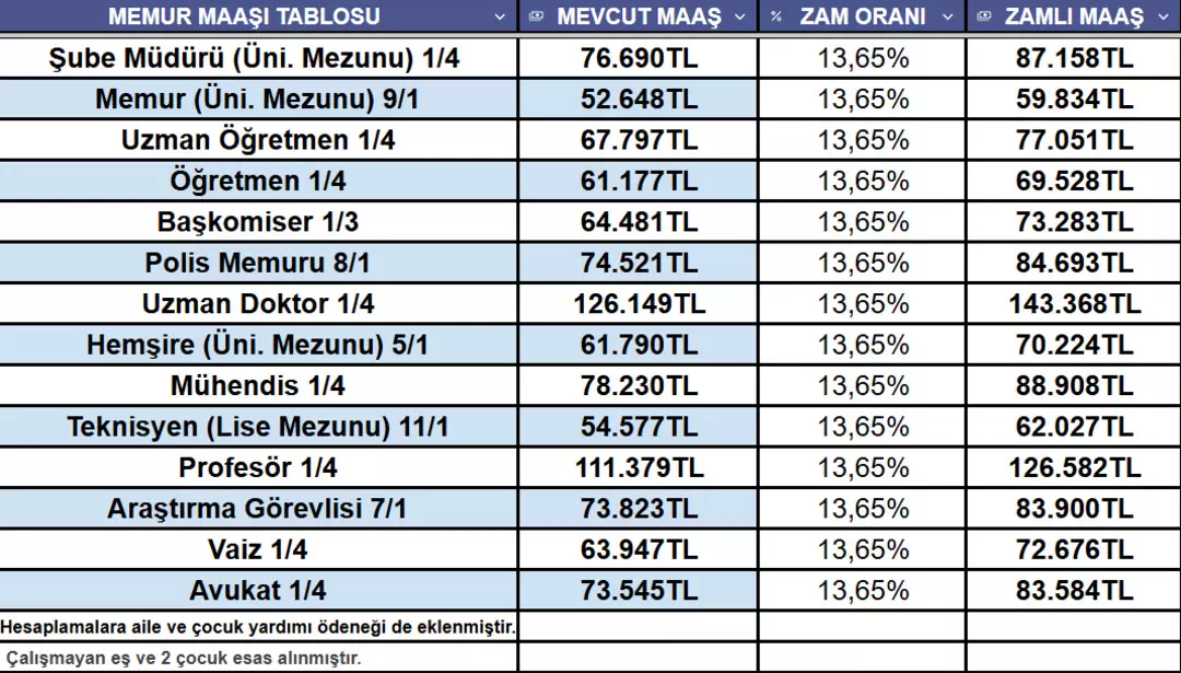 Memur ve memur emeklileri ise toplu sözleşme farkıyla birlikte %13,65 zam alacak.
