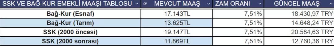 SSK ve Bağ-Kur emeklisi maaş tablosu